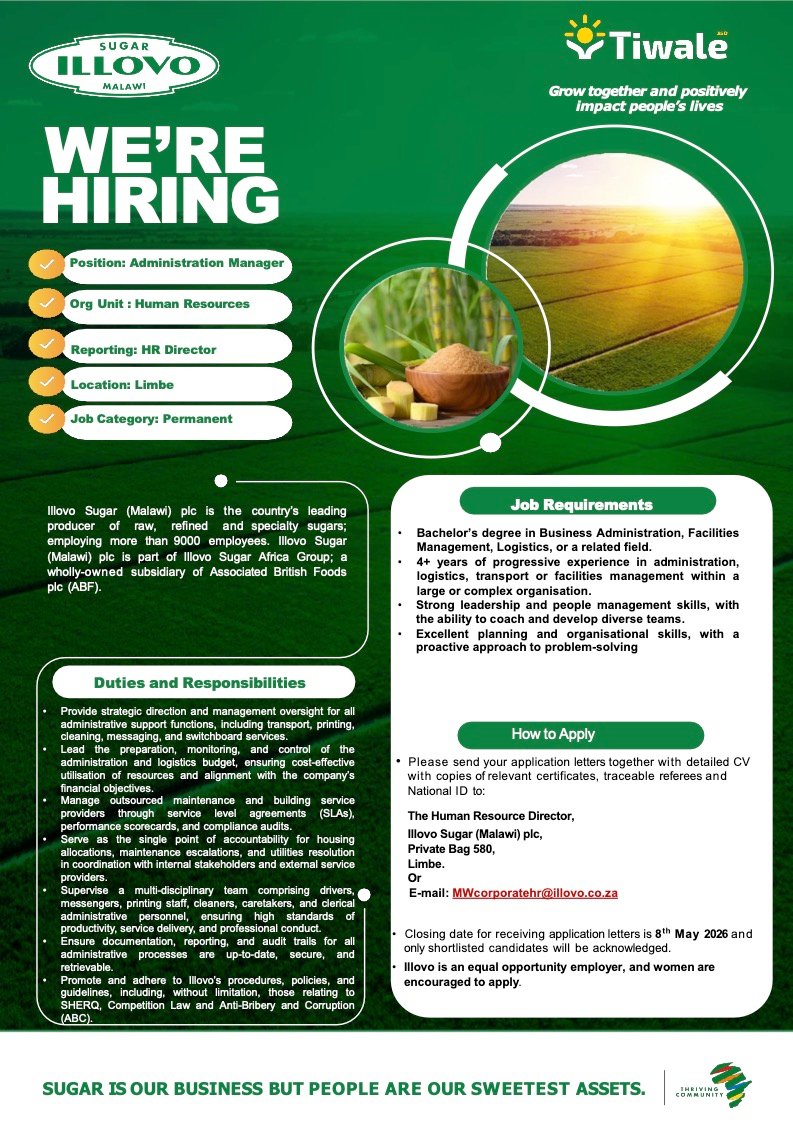 Administration Manager April 28, 2026 Admin-TFull TimeBlantyre, MalawiPosted 51 minutes ago Illovo Sugar (Malawi) plc To apply for this job email your details to MWcorporatehr@illovo.co.za Share this:TweetLike this:Like Loading...