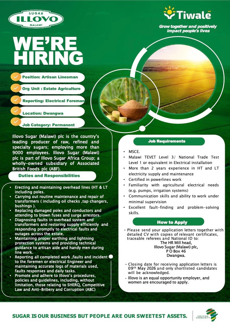 Artisan Linesman April 23, 2026 Admin-TFull TimeDwangwa, MalawiPosted 4 minutes ago Sugar Illovo Malawi Share this:TweetLike this:Like Loading...