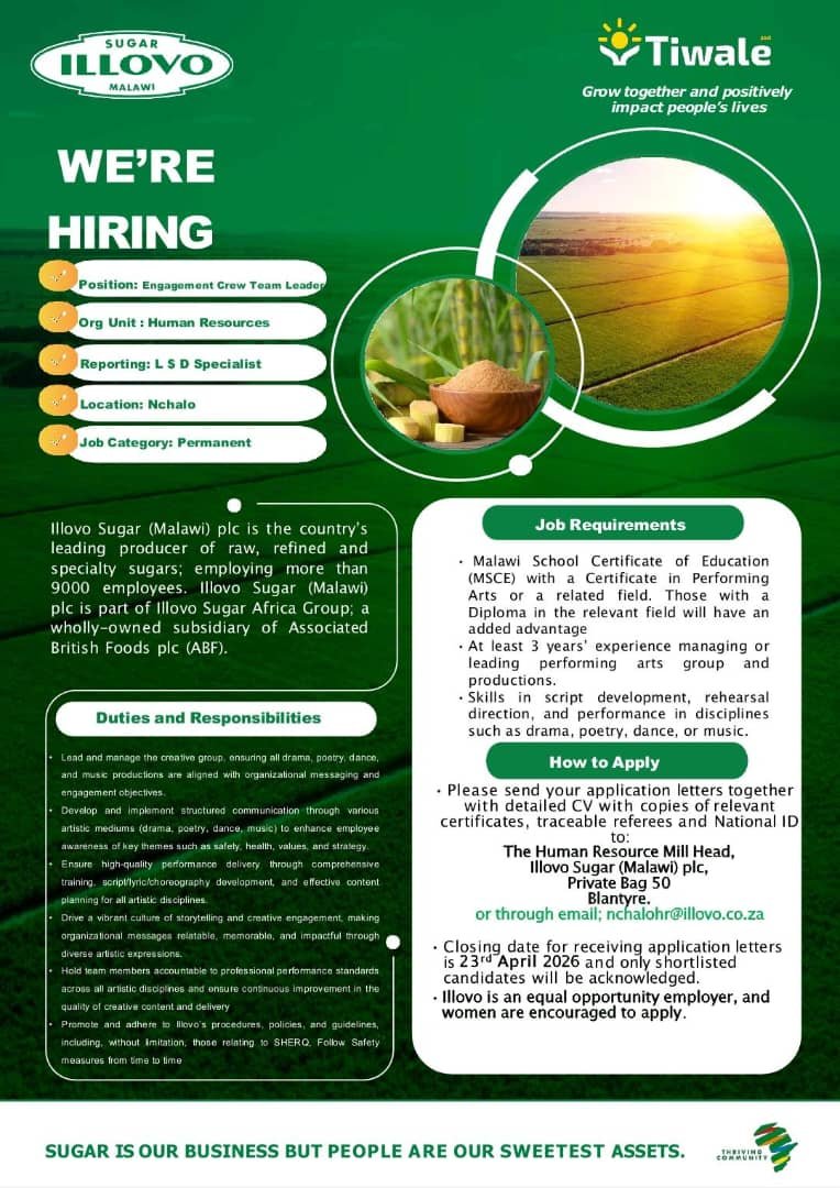 Engagement Crew Team Leader April 2, 2026 Admin-TFull TimeNchalo, MalawiPosted 1 minute ago To apply for this job please visit nchalohrillovo.co.za.Share this:TweetLike this:Like Loading...