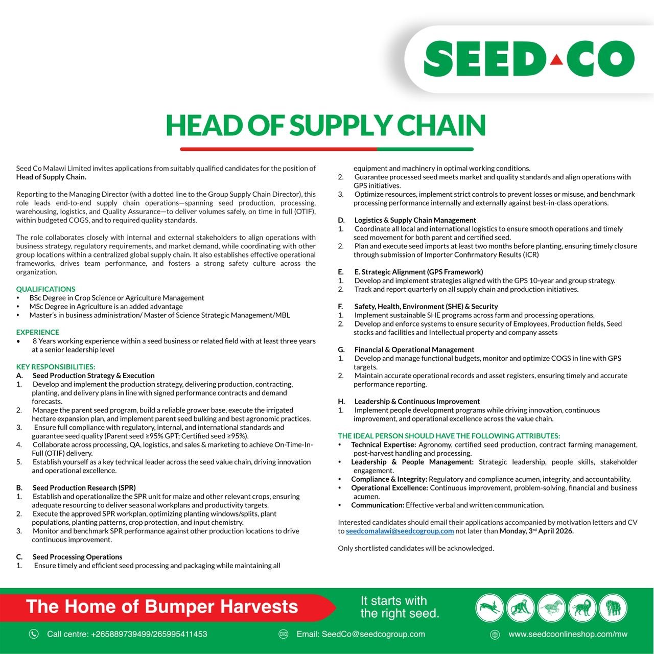 Head of Supply Chain March 19, 2026 Admin-TFull TimeLilongwe, MalawiPosted 3 minutes ago Seed Co Malawi Limited To apply for this job email your details to seedcomalawi@seedcogroup.comShare this:TweetLike this:Like Loading...