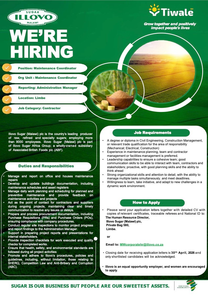 Maintenance Coordinator April 17, 2026 Admin-VOtherLimbe, BlantyrePosted 42 seconds ago Illovo Sugar (Malawi) plc To apply for this job email your details to MWcorporatehr@illovo.co.zaShare this:TweetLike this:Like Loading...