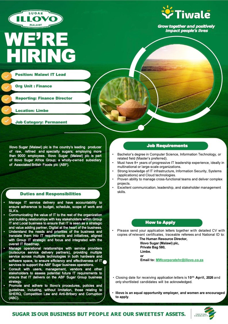 Malawi IT Lead March 31, 2026 Admin-TFull TimeBlantyre, MalawiPosted 22 hours ago Sugar Illovo Malawi To apply for this job email your details to MWcorporatehr@illovo.co.zaShare this:TweetLike this:Like Loading...