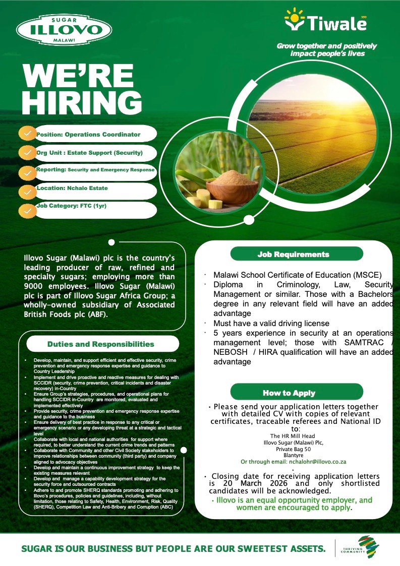Operations Coordinator March 2, 2026 Admin-VFixed ContractNchalo, ChikwawaPosted 1 month agoApplications have closed Illovo Sugar (Malawi) plcShare this:Tweet