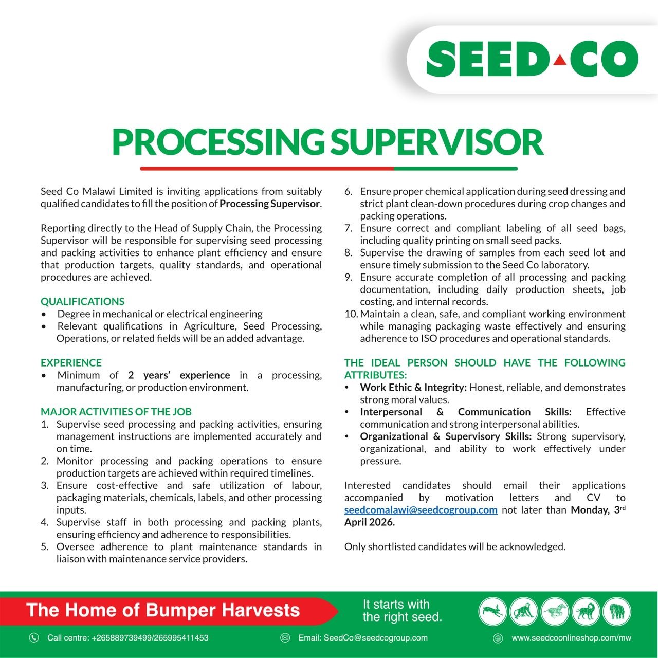 Processing Supervisor March 19, 2026 Admin-TFull TimeLilongwe, MalawiPosted 22 minutes ago Seed Co Malawi Limited To apply for this job email your details to seedcomalawi@seedcogroup.comShare this:TweetLike this:Like Loading...