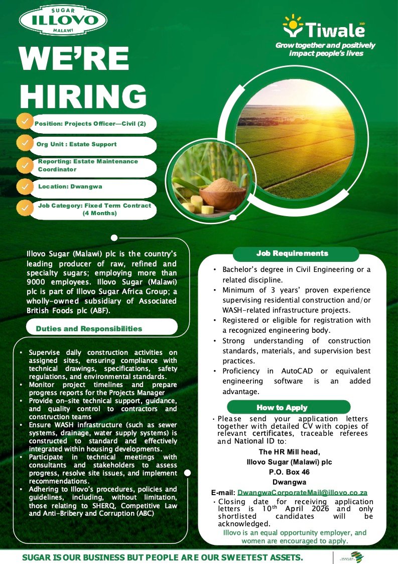 Project Officer – Civil (2) April 2, 2026 Admin-VFixed ContractDwangwa, NkhotakotaPosted 3 minutes ago Illovo Sugar (Malawi) Plc To apply for this job email your details to DwangwaCorporateMail@illovo.co.zaShare this:TweetLike this:Like Loading...