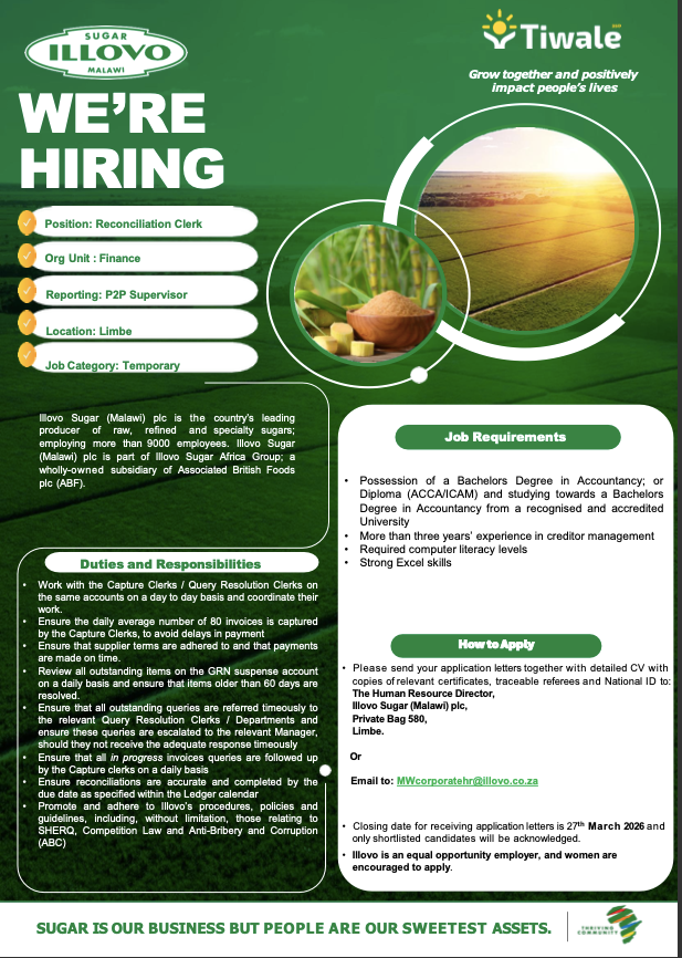 Reconciliation Clerk March 12, 2026 Admin-TTemporaryBlantyre, MalawiPosted 7 minutes ago Sugar Illovo MalawiShare this:TweetLike this:Like Loading...