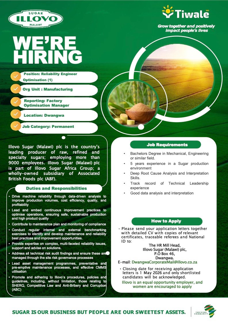 Reliability Engineer Optimisation April 20, 2026 Admin-TFull TimeDwangwa, MalawiPosted 2 minutes ago Sugar Illovo MalawiShare this:TweetLike this:Like Loading...