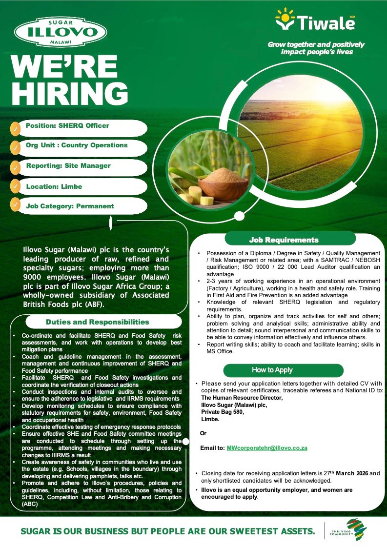 SHERQ Officer March 11, 2026 Admin-VFull TimeLimbe, BlantyrePosted 22 minutes ago Illovo Sugar (Malawi) plc To apply for this job email your details to MWcorporatehr@illovo.co.zaShare this:TweetLike this:Like Loading...
